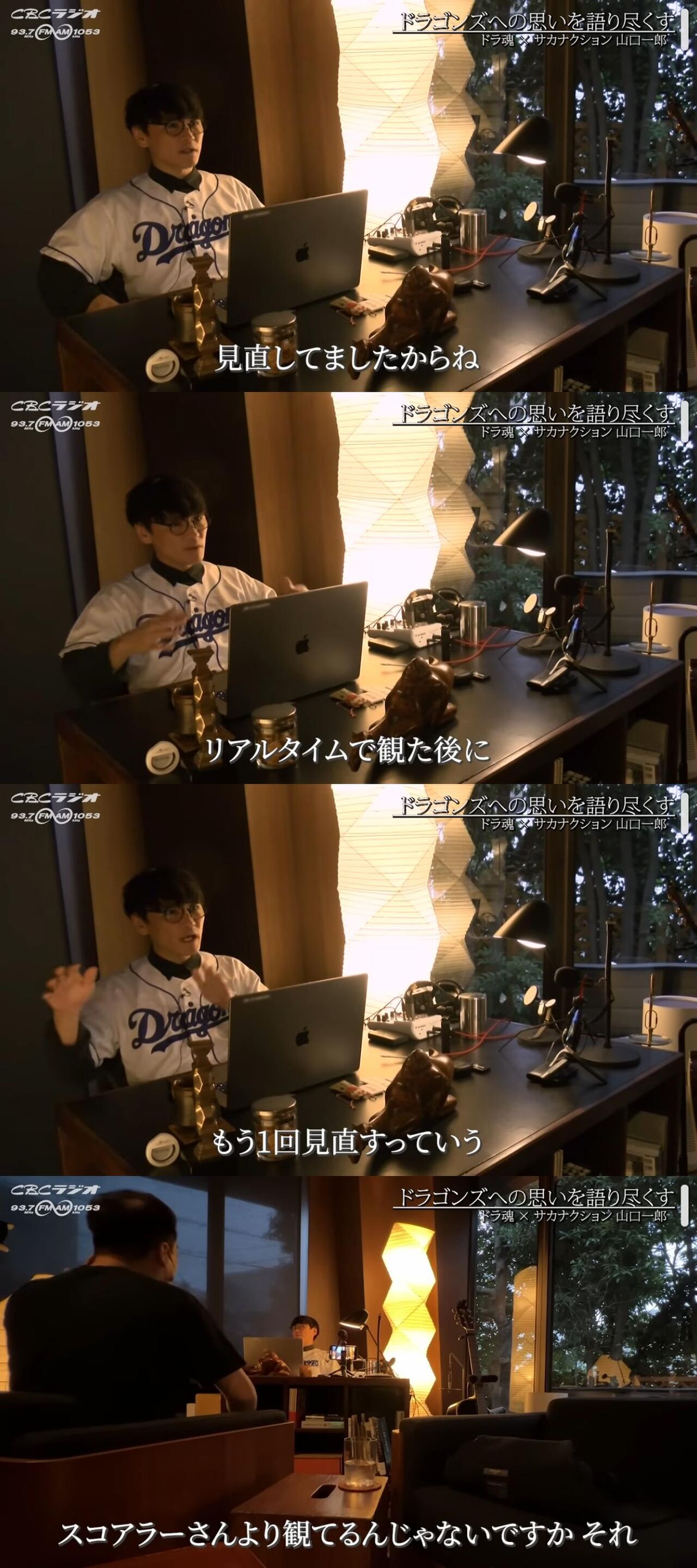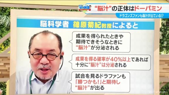「つまり、いいところはいいのよ。ダメなところはダメっていうふうに。試合の勝ち負けじゃないところで、ドラゴンズのみそ汁の上澄みみたいな部分をしっかりとすすり飲む感じ。みそ汁の上澄みね、透明なたころだけをすすり飲む感じで」と語った。