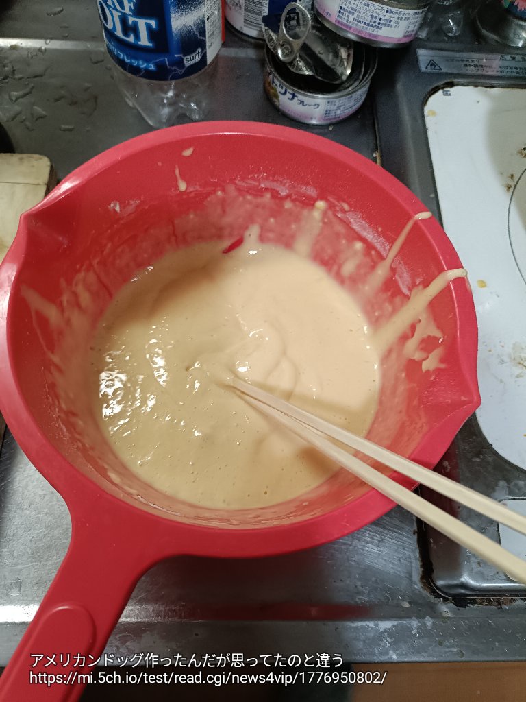 どうしよう残りの衣で粉足してリカバリーするかアメリカンドッグは諦めてパンケーキにして食うか