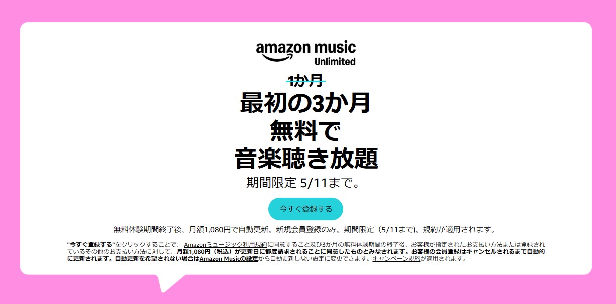 Amazon Music Unlimited 最初の3か月無料 (5/11まで)
