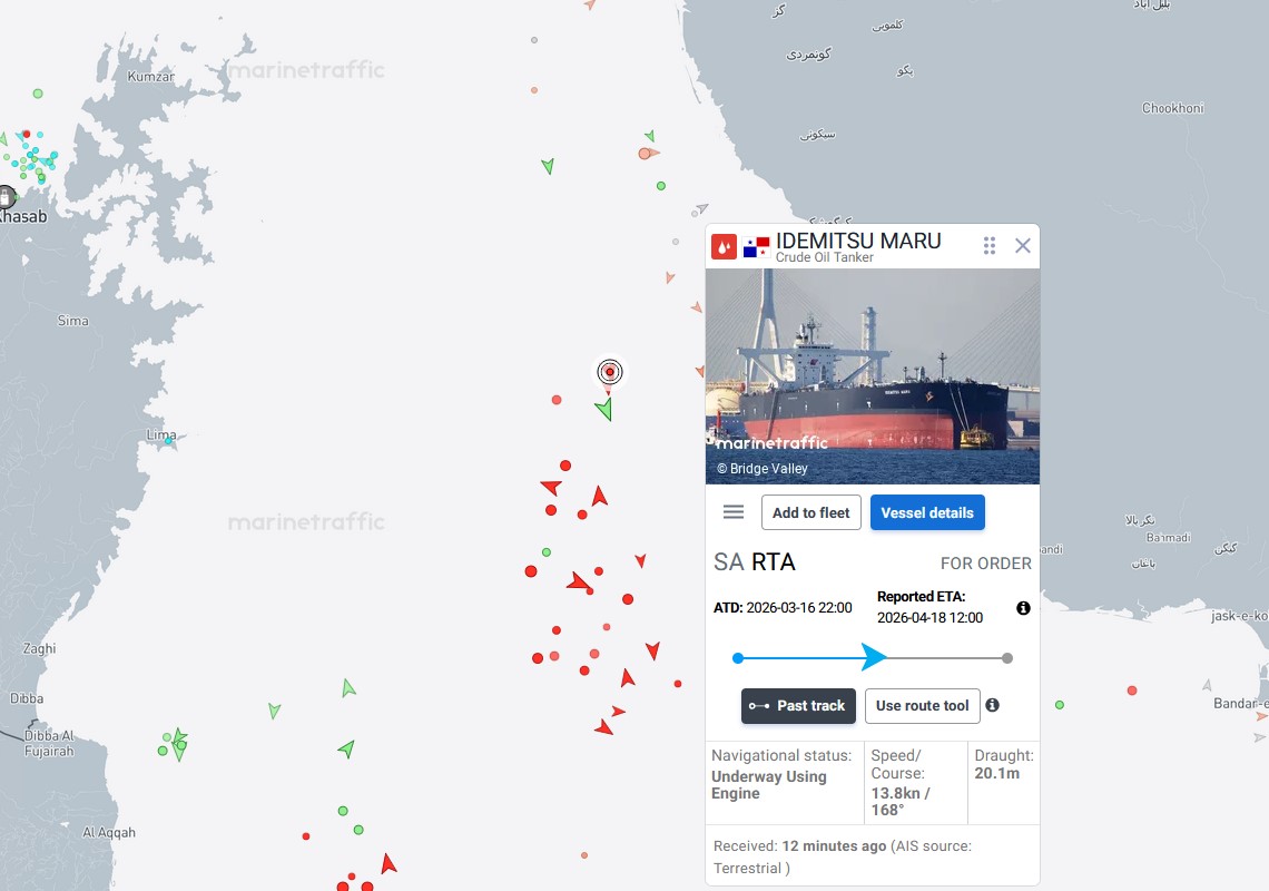 「出光丸」がホルムズ海峡を東に航行中、サウジ産の原油を積載