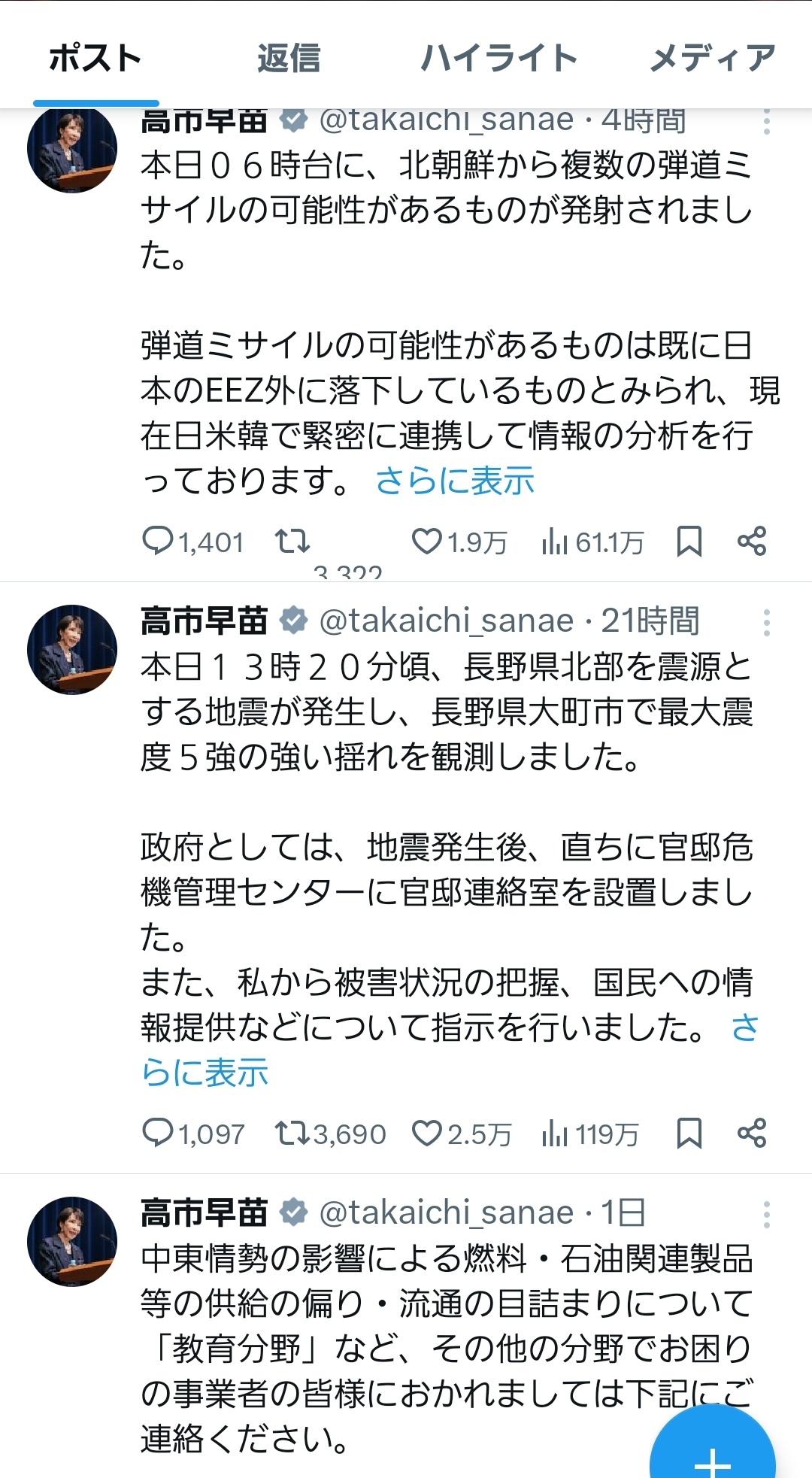 女高市、震度5強や北朝鮮ミサイルにも動じず