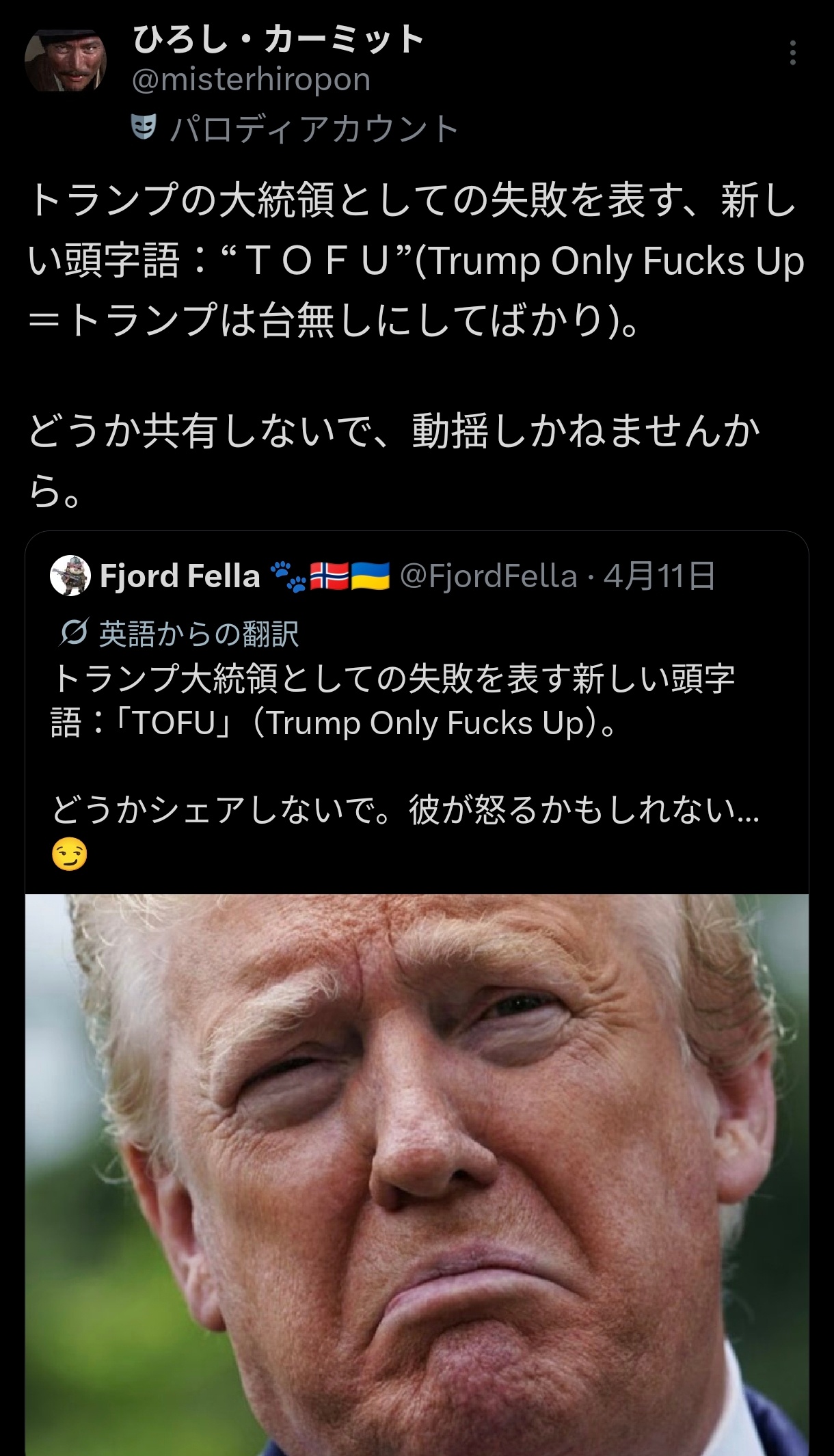 に加えて“TOFU”(Trump Only Fucks Up)って言葉が出来たらしいな
