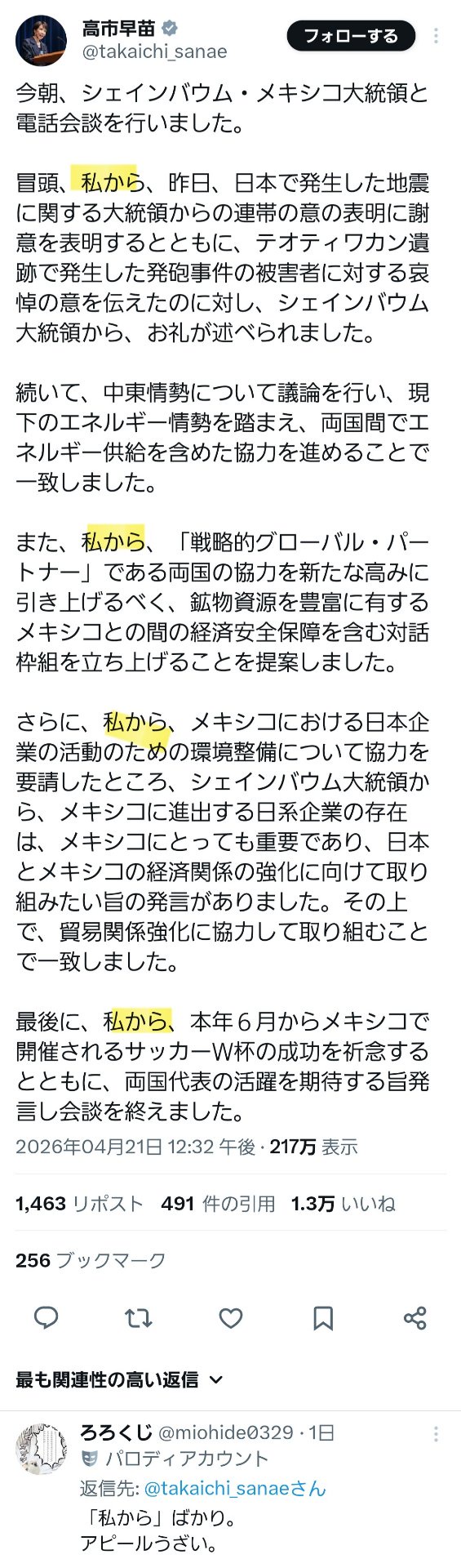 官僚の書いた文章の中にある「総理」を「私から」に変えただけなんだなあ…