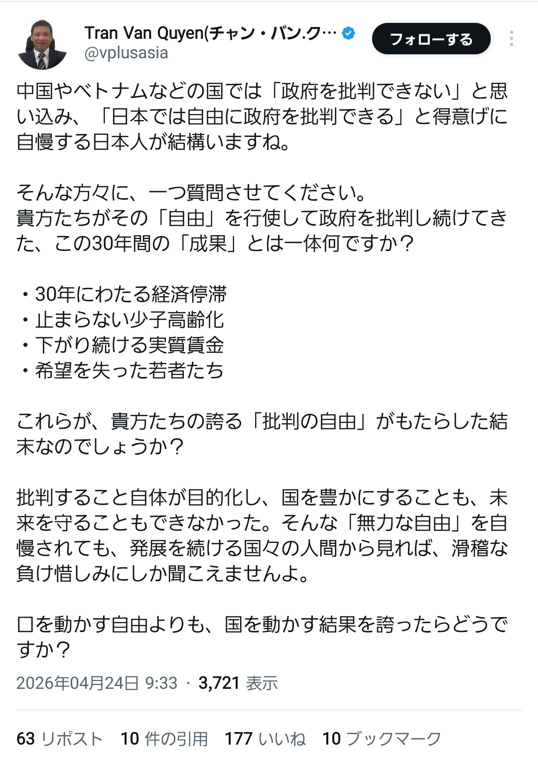 — Tran Van Quyen(チャン・バン.クエン) (@vplusasia) April 23, 2026
