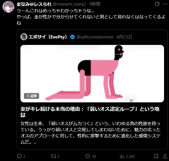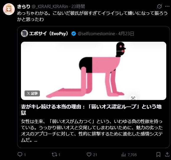 ワイらから見てもXの女さんから見ても共感されまくってるのがすべてだよな