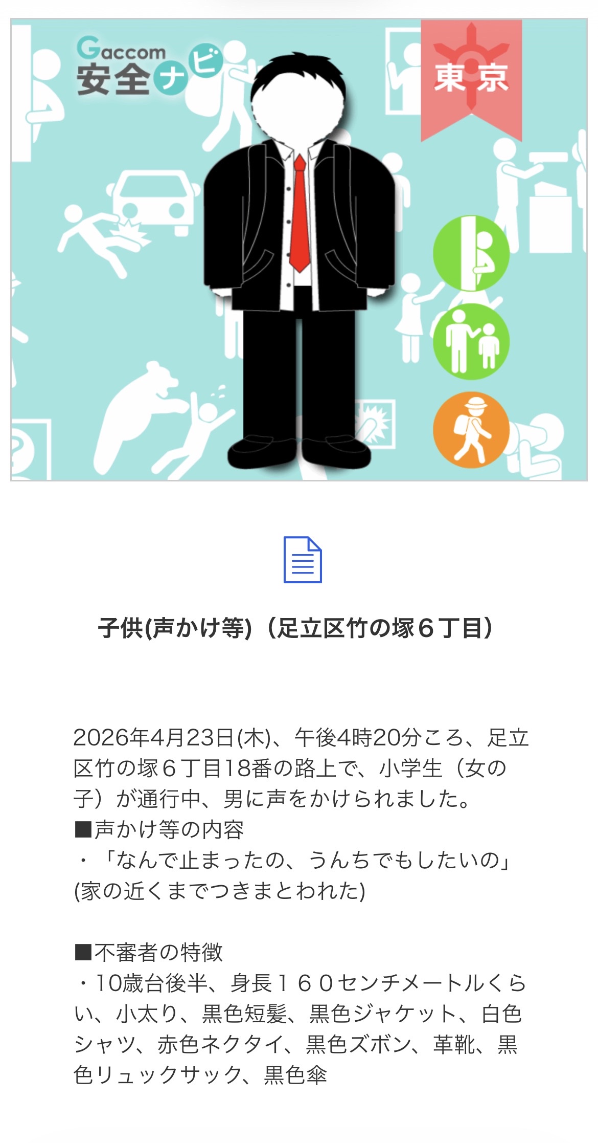 不審者の特徴◆50歳代位、身長170cm位、中肉、角張った顔、ぱっちりした二重。暗めの色のジャンパー、ズボン。