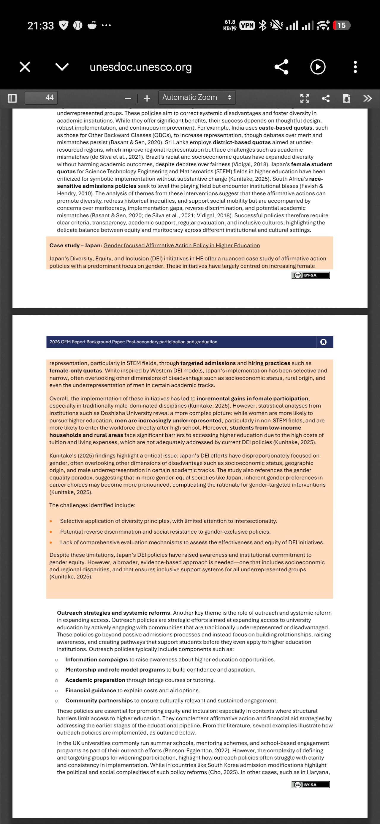 UNESCO報告書、日本「女子枠」の問題点に言及 note2026年のUNESCO世界教育モニタリング報告書(GEM Report 2026)の背景論文として、オーストラリア教育研究評議会(ACER)が執筆した系統的レビュー「Post-secondary participation and graduation」が公開された(以下、UNESCO報告書)。51カ国以上から106の政策文献を対象に、中等教育~高等教育における「アクセス」「参加」「定着」「卒業」に関わる政策を包括的に分析した報告書である。全文はこちら