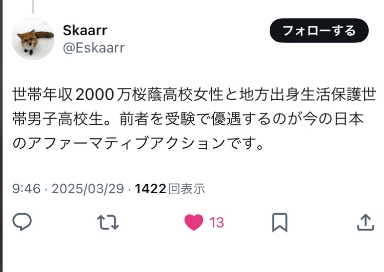 なんで女生徒の少ない全大学で女枠適用すべきって話出てんのか皆目検討つかん
