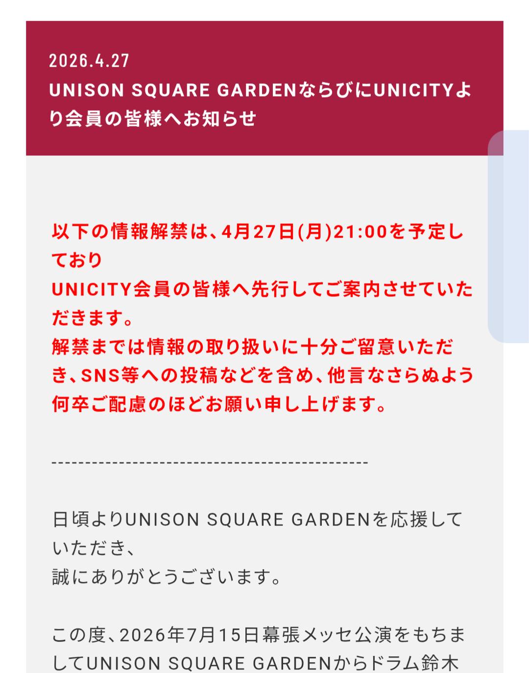 いつもUNISON SQUARE GARDENを応援してくださる皆様へ
