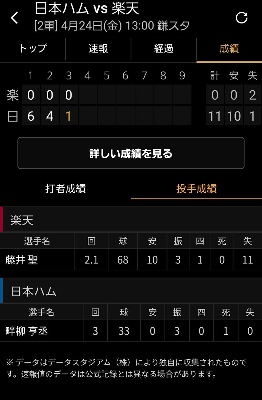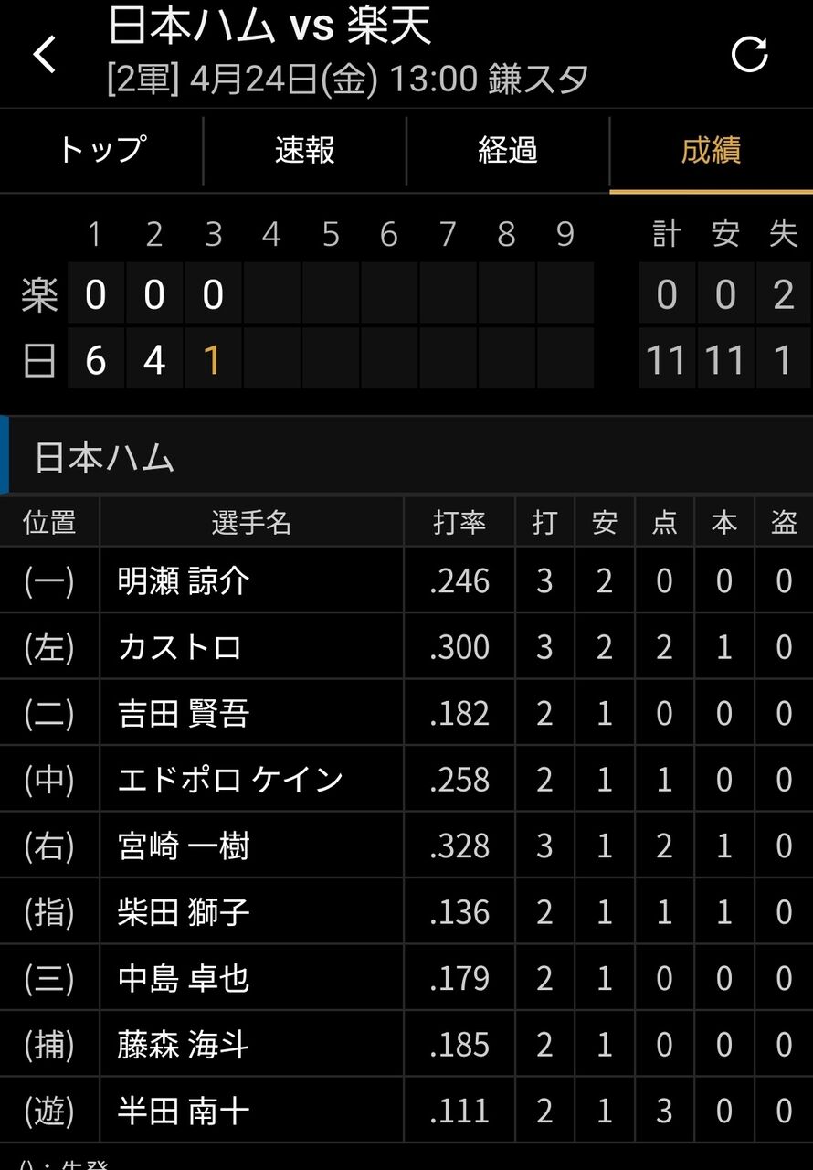 1名無し2026/04/24(金) 14:01:11.255 ID:MeGCzZqjz 2名無し2026/04/24(金) 14:02:11.182 ID:vR.Cg/ZGAバカなのは楽天の二軍監督やんけ 3名無し2026/04/24(金) 14:02:20.927 ID:MeGCzZqjz藤井聖とかいう謎の若手が燃えてるっぽい 4名無し2026/04/24(金) 14:02:34.723 ID:oAYXyoYkE両軍ホームラン出まくり乱打戦とおもったらなんですかこれは 5名無し2026/04/24(金) 14:02:49.165 ID:3F0tliO.p投手の柴田にホームラン打たれちゃいかんでしょ 6名無し2026/04/24(金) 14:03:04.795 ID:JhwIONLpNえぇ・・・上では好投したのにどうした藤井 7名無し2026/04/24(金) 14:03:05.939 ID:4EwNMxAfn一軍投手なのにどうしたんや 8名無し2026/04/24(金) 14:03:30.592 ID:Kcjl32GtW馬鹿試合ではなくね 9名無し2026/04/24(金) 14:04:11.853 ID:xFipW96ll先週1軍のロッテが6回無得点だったピッチャーなんやが 10名無し2026/04/24(金) 14:04:15.579 ID:i7oRxiIyzこの投手相手に先週6回無得点だったロッテ1軍 11名無し2026/04/24(金) 14:07:01.896 ID:MeGCzZqjz日ハム打線は別に普通の二軍メンバーやな 13名無し2026/04/24(金) 14:08:30.334 ID:2UwBZKgIk>>11カストロ吉田は普通に一軍クラスやで 14名無し2026/04/24(金) 14:08:53.392 ID:IYQ95te4o藤井ってこの前上で好投してたやん