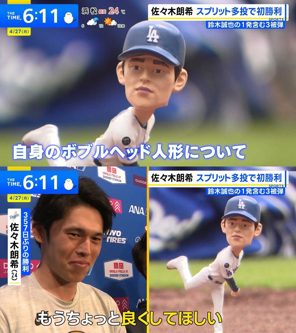 1それでも動く名無し2026/04/28(火) 07:24:35.99 ID:G9INsHHE0「4月26日の試合は、佐々木投手にとって初となる自身のボブルヘッドデー登板でした。無事、勝利を飾った後の取材でボブルヘッドについて問われると、“集めています”とコメント。自身の人形も受け取ったそうですが、デザインの出来に関しては“うーん……もうちょっと良くしてほしいです”と苦笑しながら答え、取材陣の笑いを誘っていました」(野球専門誌ライター) https://news.yahoo.co.jp/articles/0a9e27b793ba418c678dab33a75f72432e3237fa 2それでも動く名無し2026/04/28(火) 07:24:59.84 ID:G9INsHHE0 3それでも動く名無し2026/04/28(火) 07:26:09.70 ID:LB4YnsGQ0他の選手に比べたら似てるほうだと思うな 4それでも動く名無し2026/04/28(火) 07:26:21.66 ID:PjCY0J4K0大谷のよりは本人に似てるやん 5それでも動く名無し2026/04/28(火) 07:26:44.00 ID:G8/9uOUyr似てる定期 6それでも動く名無し2026/04/28(火) 07:27:18.58 ID:oQcL12TV0良くしてほしいのは成績の方だよ 7それでも動く名無し2026/04/28(火) 07:27:19.82 ID:EXY0SatA0自分のピッチングを反省しててえらい 9それでも動く名無し2026/04/28(火) 07:28:01.30 ID:RSRwrzqn0バーターのくせに出してもらえるだけありがたいと思えよ 11それでも動く名無し2026/04/28(火) 07:29:27.66 ID:t1t/z8ue0むしろだいぶ美化されてる定期 12それでも動く名無し2026/04/28(火) 07:29:36.74 ID:0lPPJdJR0大した実績なくても作ってもらえるんやな 13それでも動く名無し2026/04/28(火) 07:30:16.58 ID:pM5dn6Pvd>>12 オオタニ!ヨシノブ!言ってるジャパニーズが買うからな 18それでも動く名無し2026/04/28(火) 07:33:57.18 ID:t+8PqLq90>>13 球場配布やぞ 大谷の日は現地民でえげつない大行列や 14それでも動く名無し2026/04/28(火) 07:30:25.41 ID:3Vqlgdas0草彅に似てる 16それでも動く名無し2026/04/28(火) 07:31:49.86 ID:EyyxXKlO0ちなしょうへい 17それでも動く名無し2026/04/28(火) 07:33:31.90 ID:9vAvPnJB0>>16 畜谷としてなら似てる 19それでも動く名無し2026/04/28(火) 07:34:48.60 ID:uOqHh+fT0かなり似てるやん 20それでも動く名無し2026/04/28(火) 07:36:08.05 ID:h3Eewt2l0表情もメンタルが出てていいね 21それでも動く名無し2026/04/28(火) 07:36:53.12 ID:U2LOP5htHこれがあるからマイナー落ちにできなかった説あるな 22それでも動く名無し2026/04/28(火) 07:36:53.28 ID:UqGsuKxW0クソ似てて草 26それでも動く名無し2026/04/28(火) 07:38:38.36 ID:+dr6rd710そういうもんじゃないから、ボブルヘッドは 27それでも動く名無し2026/04/28(火) 07:42:13.07 ID:nRq+6aio0 29それでも動く名無し2026/04/28(火) 07:43:45.81 ID:c+dLKKHu0アメリカが作るボブルヘッドのクオリティは低いという最大のタブーに切り込んでしまったか 30それでも動く名無し2026/04/28(火) 07:45:15.69 ID:1GTZa9Km0他のやつより似てるしなんだったら他のやつよりよく作られてるやんけ 32それでも動く名無し2026/04/28(火) 07:48:41.79 ID:NOGLoakk0想像の5倍似てて草