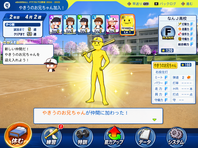 『なんJのイメージキャラクター『やきうのお兄ちゃん』(黄色い)(八頭身)が、パワプロの世界に参加してるゲーム画面を作ってください』
